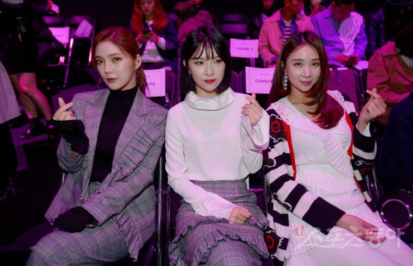 나인뮤지스 소진과 혜미, 방송인 이유애린(왼쪽부터)이 18일 서울 중구 DDP(동대문디자인플라자)에서 열린 2018 헤라 서울패션위크 ‘로맨시크(romanchic)’ 컬렉션 패션쇼에 참가해 포즈를 취하고 있다.