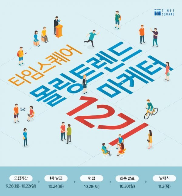 타임스퀘어가 22일까지 ‘몰링 트렌드 마케터’ 12기를 모집한다. ‘몰링 트렌드 마케터’는 타임스퀘어가 매년 상·하반기 운영 중인 대외활동 프로그램이다. 마케터를 꿈꾸는 대학생들이 쇼핑부터 외식, 문화, 엔터테인먼트에 걸쳐 마케팅 실무를 배울 수 있도록 지원한다.