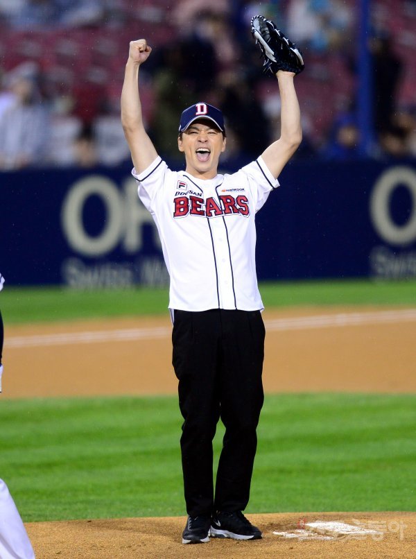 18일 서울 잠실야구장에서 ‘2017 타이어뱅크 KBO리그’ 두산 베어스와 NC 다이노스의 플레이오프 2차전 경기가 열렸다. 시구자로 나선 정상훈이 두산의 승리를 기원하고 있다.