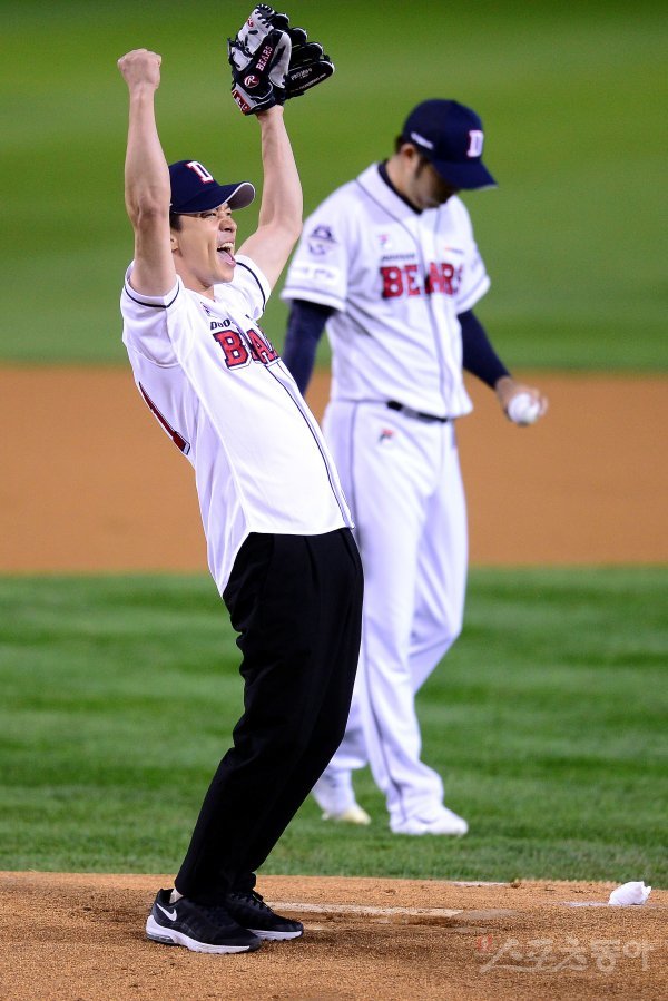 18일 서울 잠실야구장에서 ‘2017 타이어뱅크 KBO리그’ 포스트시즌 플레이오프 2차전 NC 다이노스와 두산베어스 경기가 열렸다. 경기 전 방송인 정상훈이 시구를 한 후 화이팅을 외치고 있다.