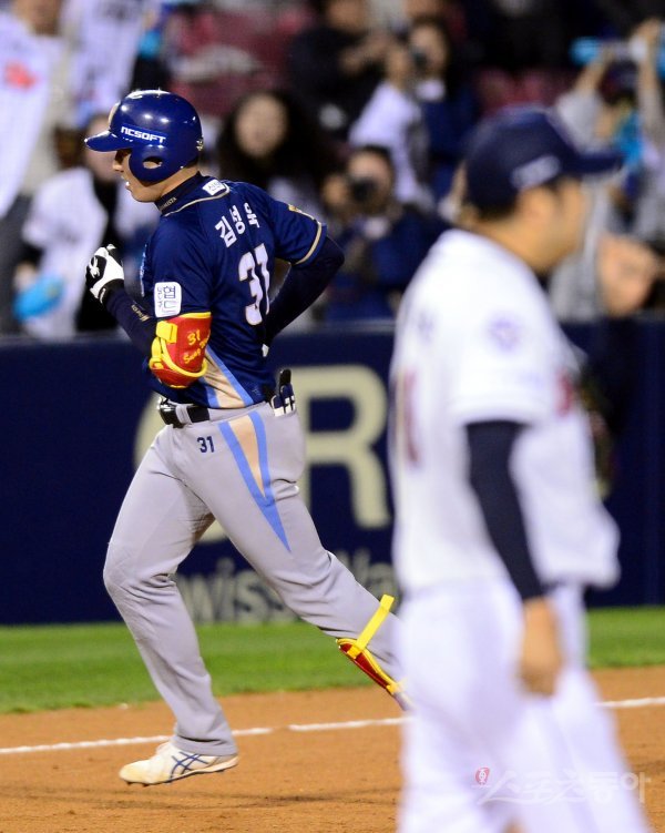 18일 서울 잠실야구장에서 ‘2017 타이어뱅크 KBO리그’ 두산 베어스와 NC 다이노스의 플레이오프 2차전 경기가 열렸다. 2회초 1사 1루에서 NC 김성욱이 두산 선발 장원준을 상대로 좌월 투런 홈런을 쏘아 올린 뒤 그라운드를 돌고 있다.