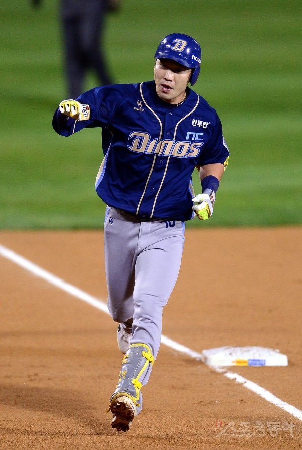18일 서울 잠실야구장에서 ‘2017 타이어뱅크 KBO리그’ 포스트시즌 플레이오프 2차전 NC 다이노스와 두산베어스 경기가 열렸다. 2회초 1사 NC 지석훈이 동점 좌월 솔로 홈런을 날리고 그라운드를 돌며 하이파이브 하고 있다.