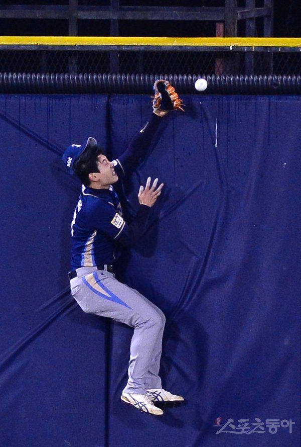 18일 서울 잠실야구장에서 ‘2017 타이어뱅크 KBO리그’ 포스트시즌 플레이오프 2차전 NC 다이노스와 두산베어스 경기가 열렸다. 1회말 2사 NC 중견수 김성욱이 두산 박건우의 타구를 펜스까지 달려가 잡으려 했으나 놓치고 있다. 이 타구는 비디오판독 결과 홈런으로 판정되었다.