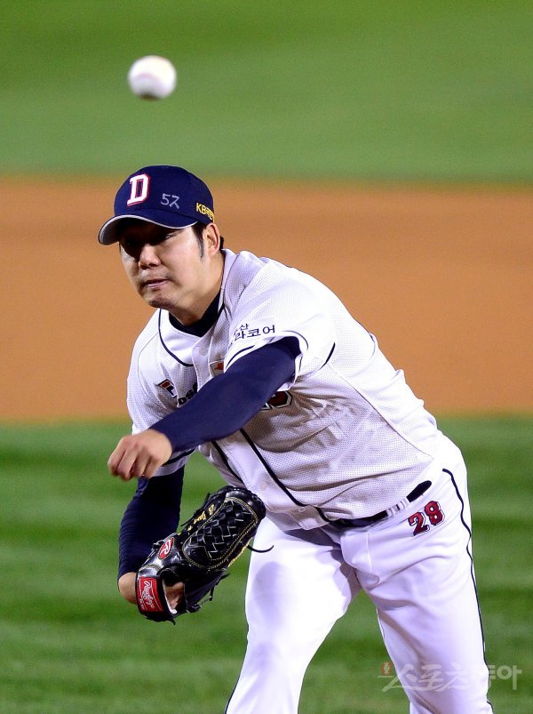 18일 서울 잠실야구장에서 ‘2017 타이어뱅크 KBO리그’ 포스트시즌 플레이오프 2차전 NC 다이노스와 두산베어스 경기가 열렸다. 선발 투수로 등판한 두산 장원준이 역투하고 있다.