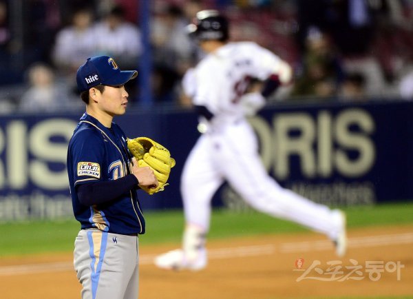 18일 서울 잠실야구장에서 ‘2017 타이어뱅크 KBO리그’ 두산 베어스와 NC 다이노스의 플레이오프 2차전 경기가 열렸다. 3회말 2사 1, 3루에서 두산 김재환에게 3점 홈런을 허용한 NC 선발 이재학이 아쉬워하고 있다.