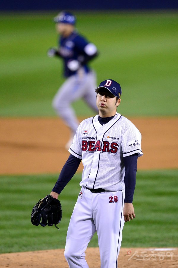 18일 서울 잠실야구장에서 ‘2017 타이어뱅크 KBO리그’ 포스트시즌 플레이오프 2차전 NC 다이노스와 두산베어스 경기가 열렸다. 선발 투수로 등판한 두산 장원준이 5회초 무사 1루 NC 나성범에게 역전 중월 투런 홈런을 허용한 후 아쉬워하고 있다.