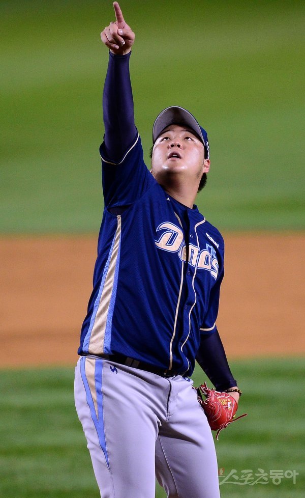 18일 서울 잠실야구장에서 ‘2017 타이어뱅크 KBO리그’ 포스트시즌 플레이오프 2차전 NC 다이노스와 두산베어스 경기가 열렸다. 4회말 1사 2루 NC 이민호가 두산 오재원의 파울 타구 위치를 알려주고 있다.