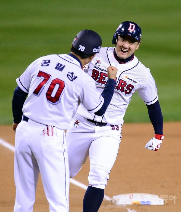 18일 서울 잠실야구장에서 ‘2017 타이어뱅크 KBO리그’ 포스트시즌 플레이오프 2차전 NC 다이노스와 두산베어스 경기가 열렸다. 6회말 무사 만루 두산 최주환이 좌월 만루 홈런을 날리고 그라운드를 돌며 하이파이브 하고 있다.