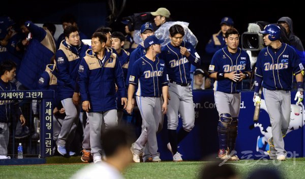 18일 서울 잠실야구장에서 ‘2017 타이어뱅크 KBO리그’ 두산 베어스와 NC 다이노스의 플레이오프 2차전 경기가 열렸다. 두산에 7-17로 패한 NC 선수들이 아쉬워하고 있다.