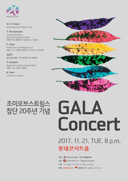 다양하고 참신한 기획 공연과 해외 초청연주로 사랑 받아 온 국내 대표적인 현악앙상블 조이오브스트링스(Joy of Strings)가 창단 20주년을 맞아 11월21일 오후 8시 롯데콘서트홀에서 <창단 20주년 기념 갈라콘서트>를 개최한다.