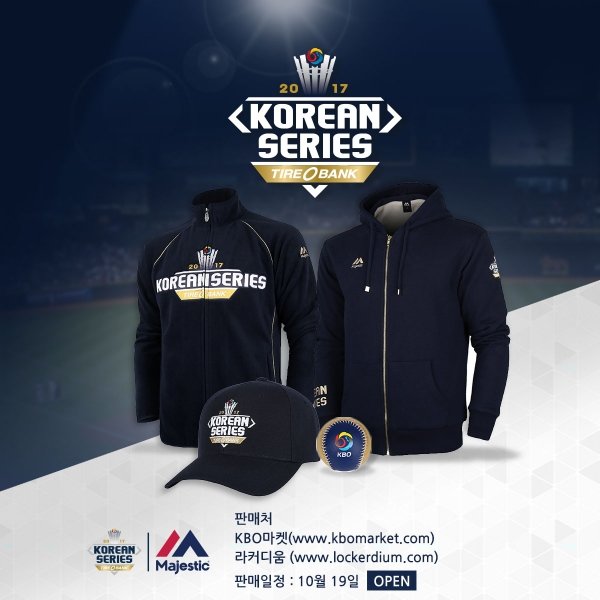 2017 타이어뱅크 KBO 한국시리즈의 공식 상품 제작사인 마제스틱(케이엔코리아)이 19일 한국시리즈 플리스 자켓, 써멀 후드티, 기념 모자, 기념구 등 총 네 종류의 한국시리즈 관련 상품들을 출시하고 판매에 들어간다.