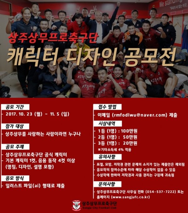 상주상무프로축구단을 아끼고 사랑하는 사람이라면 누구나 참가 가능하며 기본 캐릭터 1컷, 응용 동작 4컷 이상(명칭, 디자인, 설명 포함)을 일러스트 파일(ai) 형태로 이메일 제출하면 된다. 상금으로는 1등 100만원, 2등 50만원, 3등 20만원 각각 1명씩 수상한다.
