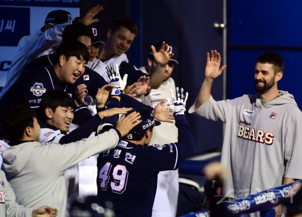 20일 창원 마산야구장에서 ‘2017 타이어뱅크 KBO리그’ 두산 베어스와 NC 다이노스의 플레이오프 3차전 경기가 열렸다. 2회초 1사 만루에서 두산 민병헌이 NC 해커를 상대로 우월 만루 홈런을 쏘아 올린 뒤 동료들과 기쁨을 나누고 있다.