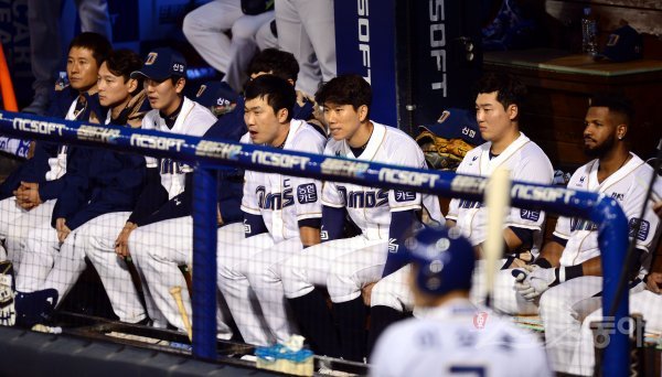 20일 창원 마산야구장에서 ‘2017 타이어뱅크 KBO리그’ 두산 베어스와 NC 다이노스의 플레이오프 3차전 경기가 열렸다. 3-14로 뒤진 9회말 NC의 마지막 공격 때 선수들이 더그아웃에서 경기를 지켜보고 있다.