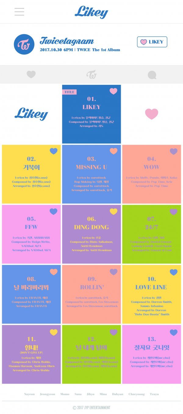 해당 트랙리스트 이미지는 앨범명 ‘트와이스타그램’처럼 SNS 피드 화면을 떠올리게 하는 구성에 각 13곡의 신곡 크레딧을 공개해 눈길을 사로잡았는데, 이 중 가장 큰 관심을 모으고 있는 타이틀곡 ‘라이키’의 작사, 작곡가가 밝혀져 트와이스 컴백을 기다려 온 많은 이들의 기대감을 높였다.