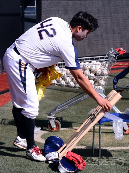 21일 창원 마산야구장에서 ‘2017 타이어뱅크 KBO리그’ 두산 베어스와 NC 다이노스의 플레이오프 4차전 경기가 열린다. 경기 전 NC 김태군이 배트를 정리하고 있다. 마산 | 김민성 기자 marineboy@donga.com