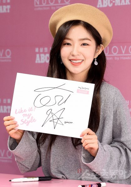 레드벨벳 아이린이 21일 서울 마포구 동교동에 위치한 한 신발 팝업 스토어에서 열린 신제품 출시 기념 사인회에서 사인지를 들고 포즈를 취하고 있다. 김진환 기자 kwangshin00@donga.com