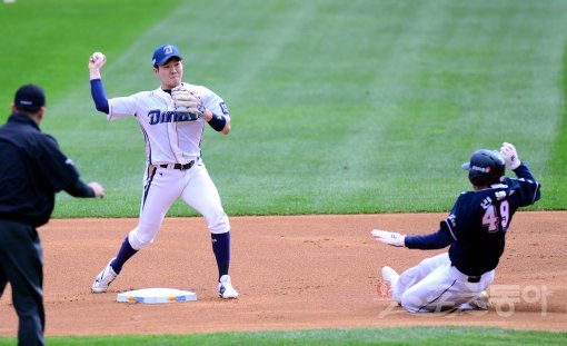 21일 창원 마산야구장에서 ‘2017 타이어뱅크 KBO리그’ 두산 베어스와 NC 다이노스의 플레이오프 4차전 경기가 열렸다. 1회초 1사 1루에서 두산 박건우의 내야 땅볼 때 1루 주자 민병헌이 2루에서 NC 박민우에게 포스 아웃되고 있다. 마산 | 김민성 기자 marineboy@donga.com
