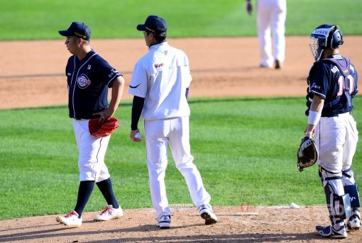 21일 창원 마산야구장에서 ‘2017 타이어뱅크 KBO리그’ 두산 베어스와 NC 다이노스의 플레이오프 4차전 경기가 열렸다. 5회말 2사 1, 2루에서 NC 지석훈에게 동점 적시타를 허용한 두산 선발 유희관이 마운드를 내려가고 있다. 마산 | 김민성 기자 marineboy@donga.com