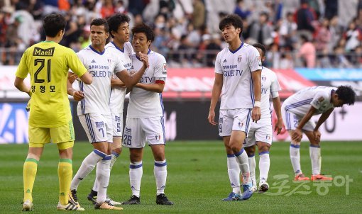 21일 서울월드컵경기장에서 열린 ‘KEB하나은행 K리그 클래식 2017’ 35라운드 FC서울과 수원삼성의 89번 째 슈퍼매치 경기에서 양 팀이 치열한 공방전 끝에 2-2 무승부를 거뒀다. 경기 후 수원삼성 선수들이 서로를 격려하고 있다. 상암 | 김진환 기자 kwangshin00@donga.com