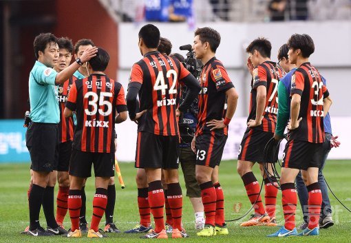 21일 서울월드컵경기장에서 열린 ‘KEB하나은행 K리그 클래식 2017’ 35라운드 FC서울과 수원삼성의 89번 째 슈퍼매치 경기에서 양 팀이 치열한 공방전 끝에 2-2 무승부를 거뒀다. 경기 후 FC서울 선수들이 심판에게 마지막 허용한 동점골 판정에 대해 강하게 항의하고 있다. 상암 | 김진환 기자 kwangshin00@donga.com