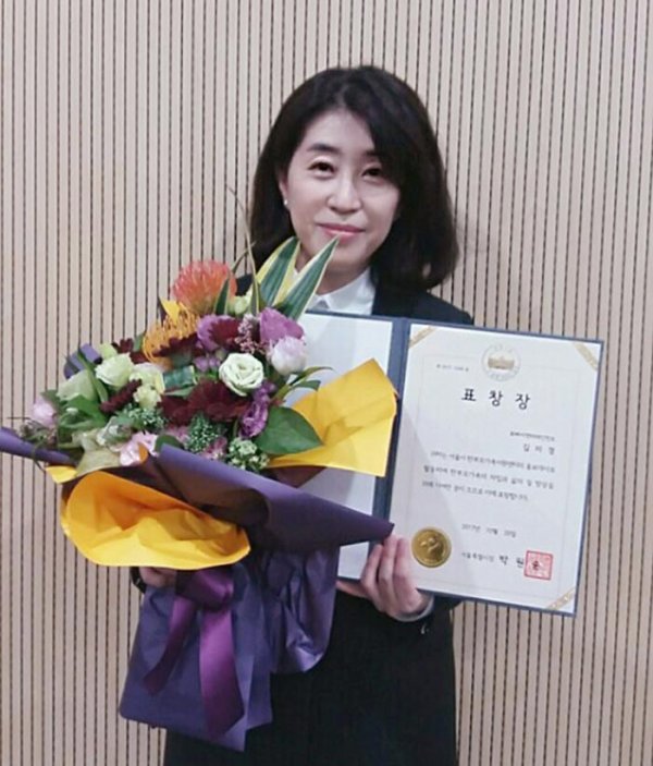 김미경은 지난 20일 ‘서울특별시한부모가족지원센터’에서 주최 및 주관하는 한부모 권익증진 포럼을 통해 2017년 한부모가족지원 유공자 표창을 받아 한부모가족지원센터의 홍보대사로 기여한 공을 인정받았다.