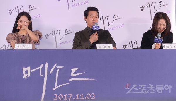 배우 박성웅(가운데)이 23일 서울 용산구 CGV 용산아이파크몰에서 열린 영화 ‘메소드’ 언론시사회 및 기자간담회에서 취재진의 질문에 답변하고 있다.