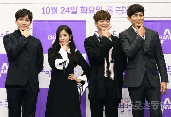 출연 배우들이 23일 서울 마포구 상암동 스탠포드 호텔에서 열린 채널A 웹드라마 ‘로맨스 특별볍’ 제작발표회에서 포즈를 취하고 있다. 왼쪽부터 빅스 혁, 에이핑크 박초롱, 배우 김민규, 류진.