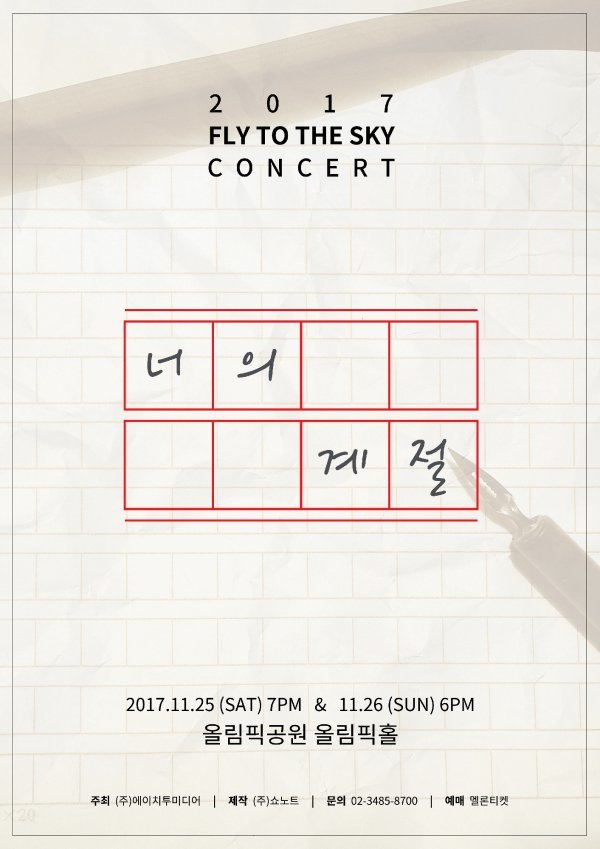 플라이 투 더 스카이는 11월 25일~26일 양일간 올림픽공원 올림픽홀에서 2017 플라이 투 더 스카이 콘서트 ‘너의 계절’을 개최 한다.