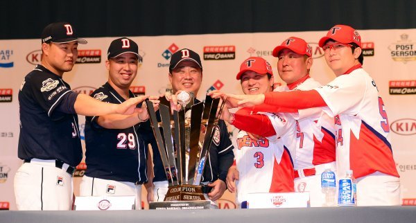 ‘2017 타이어뱅크 KBO리그’ 한국시리즈 두산베어스와 KIA타이거즈 미디어데이가 24일(화) 광주 전남대학교 용지관 컨벤션홀에서 개최됐다. 미디어데이에 참가한 두산 김태형 감독, 유희관, 오재일과 KIA 김기태 감독과 양현종, 김선빈이 포토타임을 갖고 있다.