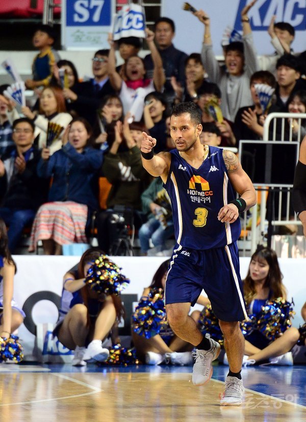24일 전주실내체육관에서 열린 ‘2017-2018 정관장 프로농구’ 안양 KGC인삼공사와 전주 KCC 경기에서 KCC 전태풍이 3점슛을 성공시킨 후 기뻐하고 있다.