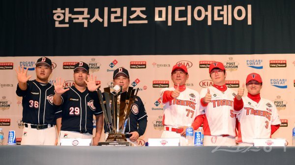 한국시리즈(KS) 미디어데이가 열린 24일 전남대학교 용지관 컨벤션홀. 행사가 끝난 뒤 시리즈 전망에 대한 질문이 나오자 두산 김태형 감독과 유희관, 오재일은 손가락 5개를 펴 보였다. 시리즈를 5차전에서 끝내겠다는 의미였다. KIA 김기태 감독과 양현종, 김선빈은 엄지손가락을 치켜세우며 “6차전이라는 뜻”이라고 밝혔다. 이 장면에는 홈 팬들의 환호를 받으며 우승을 확정하겠다는 양 팀의 강한 열망이 담겨있었다.