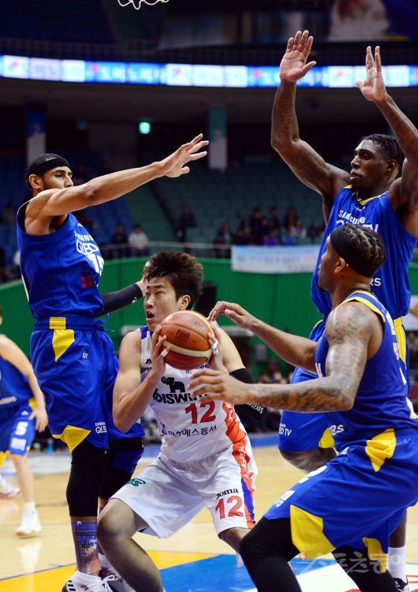 25일 서울 잠실실내체육관에서 열린 ‘2017-2018 정관장 프로농구’ 서울 삼성과 인천 전자랜드의 경기에서 전자랜드 정효근이 돌파할 때 삼성 수비수들이 협력 수비를 펼치고 있다.