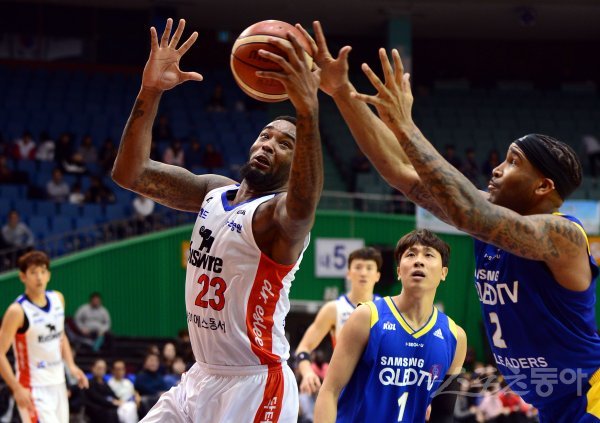 25일 서울 잠실실내체육관에서 열린 ‘2017-2018 정관장 프로농구’ 서울 삼성과 인천 전자랜드의 경기에서 전자랜드 몰트리가 삼성 커밍스와 리바운드를 다투고 있다.