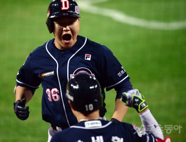 25일 광주-기아 챔피언스 필드에서 ‘2017 타이어뱅크 KBO리그’ 포스트시즌 한국시리즈 1차전 두산베어스와 KIA타이거즈 경기가 열렸다. 5회초 1사 두산 오재일이 우중월 솔로 홈런을 날리고 그라운드를 돌아 홈인해 하이파이브 하고 있다
