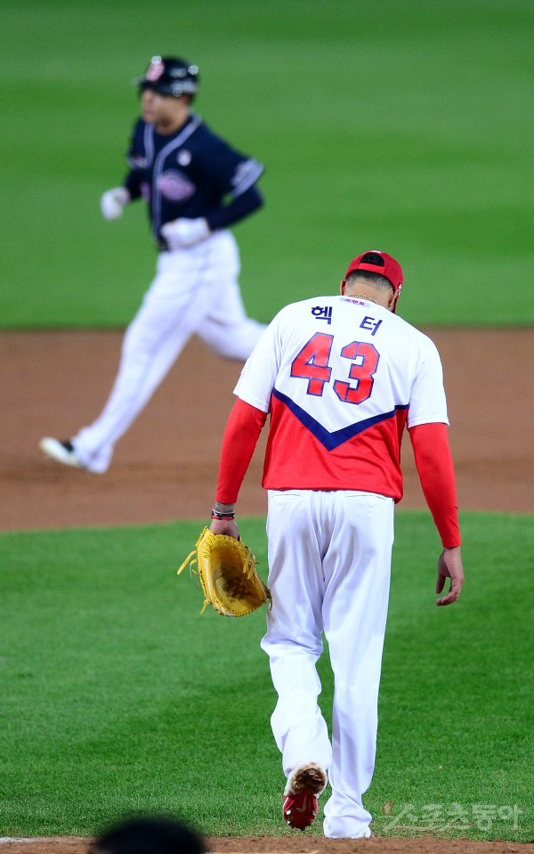 25일 광주-기아 챔피언스 필드에서 ‘2017 타이어뱅크 KBO리그’ 포스트시즌 한국시리즈 1차전 두산베어스와 KIA타이거즈 경기가 열렸다. 선발 투수로 등판한 KIA 헥터가 5회초 1사 1루 두산 김재환에게 우월 투런 홈런을 허용한 후 아쉬워하고 있다