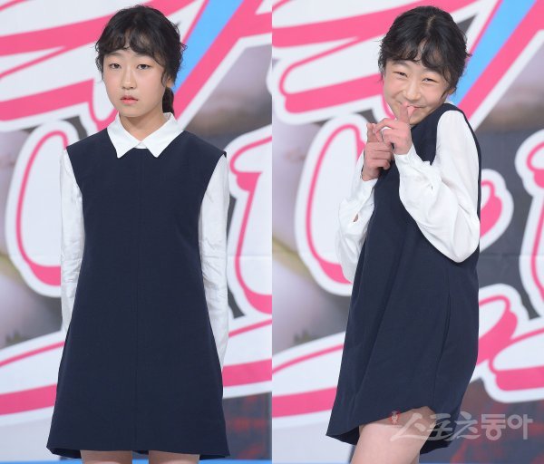 배우 김환희가 26일 서울 영등포 타임스퀘어 내 아모리스홀에서 열린 SK브로드밴드 ‘oksusu’ 오리지널 드라마 ‘복수노트’ 제작발표회에서 영화 ‘곡성’에서의 포즈와 ‘복수노트’의 포즈(오른쪽)를 취하고 있다.
