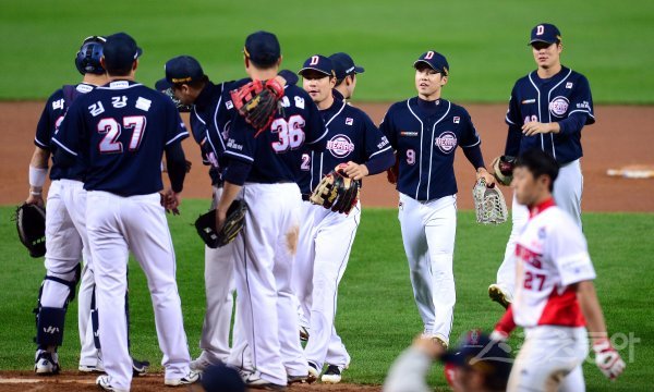 25일 광주-기아 챔피언스 필드에서 ‘2017 타이어뱅크 KBO리그‘ 포스트시즌 한국시리즈 1차전 두산베어스와 KIA타이거즈 경기가 열렸다. 5-3 승리를 거둔 두산 선수들이 하이파이브 하고 있다. 광주 | 김종원 기자 won@donga.com