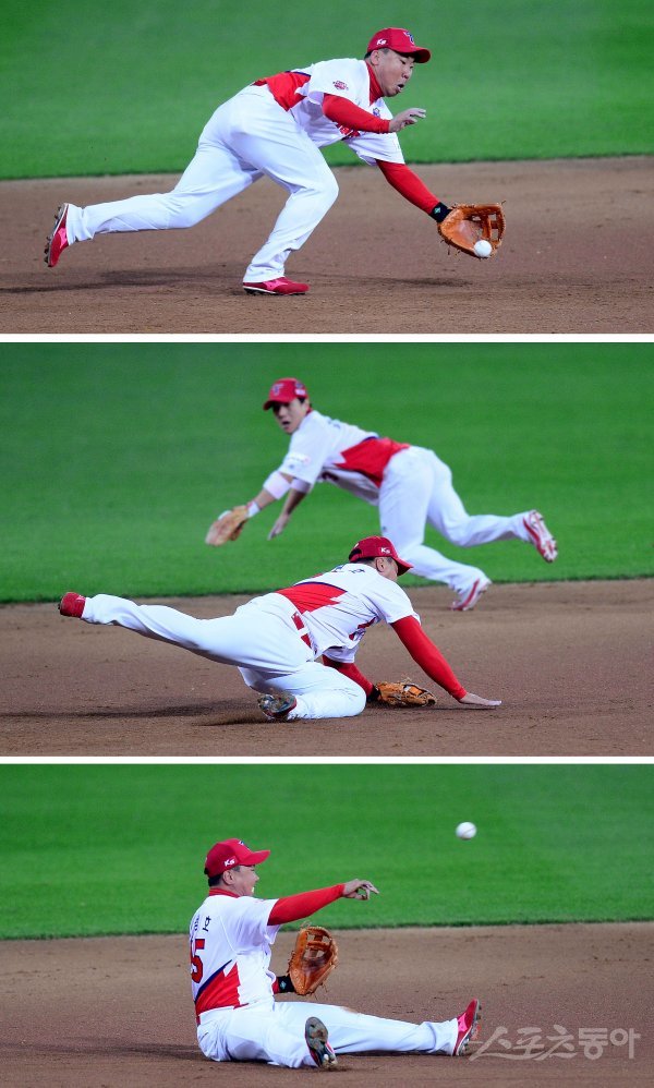 26일 광주-기아 챔피언스 필드에서 ‘2017 타이어뱅크 KBO리그’ 포스트시즌 한국시리즈 2차전 두산베어스와 KIA타이거즈 경기가 열렸다. 5회초 무사 1루 KIA 이범호가 두산 에반스의 타구를 다이빙캐치로 잡아 앉아서 송구하고 있다다.
