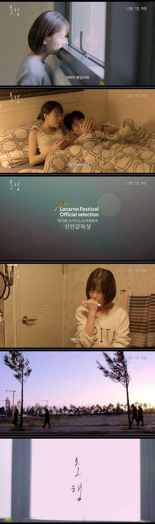 제70회 로카르노국제영화제 수상에 빛나는 ‘초행’(감독 김대환 | 출연 김새벽, 조현철 | 제작 봄내필름ㅣ제공 전주국제영화제 | 배급 ㈜인디플러그ㅣ개봉 2017년 12월 7일)의 개봉일과 티저예고편이 공개되자마자 관심이 집중되어, 1차 예고편을 추가로 공개했다.