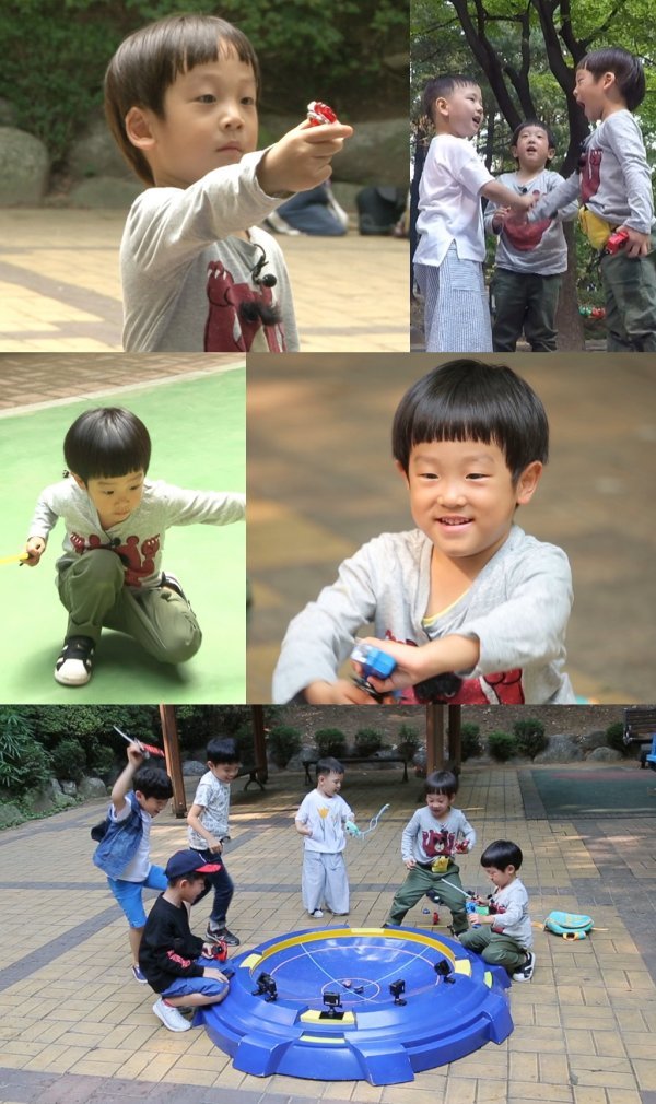 이날 서언·서준이는 단짝 친구 승훈이와 반가운 재회를 했다. 만나자마자 가방에서 팽이를 꺼낼 만큼 팽이에 푹 빠진 세 아이는 더할 나위 없이 즐거운 시간을 보내게 됐다고 한다. 팽이 놀이를 하는 초등학생 형들을 만나 팽이 대결을 펼치게 된 것. ‘전설의 갤럭시 제우스’라는 팀명을 지은 팽이 고수 형들에 맞서, 삼총사는 ‘전설의 부자’로 팀명을 정하고 승리 의지를 불태웠다는 후문이다.