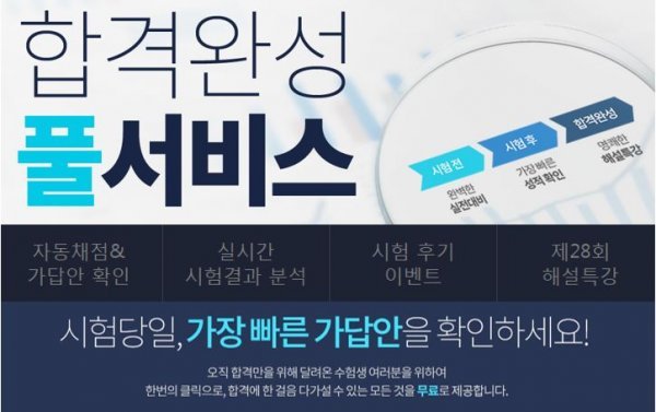 <합격 완성 풀 서비스>는 시험 전후로 수험생들에게 필요한 편의를 제공하는 서비스로 시험 후 서비스는 가답안 및 자동채점, 실시간 시험결과 분석, 시험 후기 이벤트, 제28회 해설특강 등이 있다.