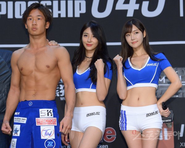 27일 경기도 고양시 일산동구 엠블호텔 고양에서 ‘XIAOMI ROAD FC 043’ 공식 계체량 행사가 열렸다. 로드걸 임지우와 최슬기(오른쪽)가 제 5경기 65.5kg 페더급 경기에 출전하는 아사쿠라 미쿠라와 함께 포토타임을 갖고 있다. ‘XIAOMI ROAD FC 043’는 28일 오후 8시 서울 중구 장충체육관에서 열린다.