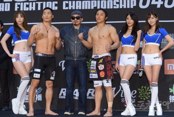 27일 경기도 고양시 일산동구 엠블호텔 고양에서 ‘XIAOMI ROAD FC 043’ 공식 계체량 행사가 열렸다. 제 4경기 70kg 라이터급 경기에 출전하는 남의철과 정두제(오른쪽)가 박상민 FC부대표(가운데)를 비롯한 로드걸들과 포토타임을 갖고 있다. ‘XIAOMI ROAD FC 043’는 28일 오후 8시 서울 중구 장충체육관에서 열린다.