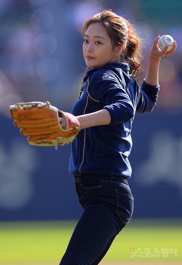 28일 서울 잠실야구장에서 ‘2017 타이어뱅크 KBO리그’ 포스트시즌 한국시리즈 3차전 KIA타이거즈와 두산베어스의 경기가 열렸다. 배우 전소민이 경기를 앞두고 열린 시구행사에서 힘차게 공을 던지고 있다.