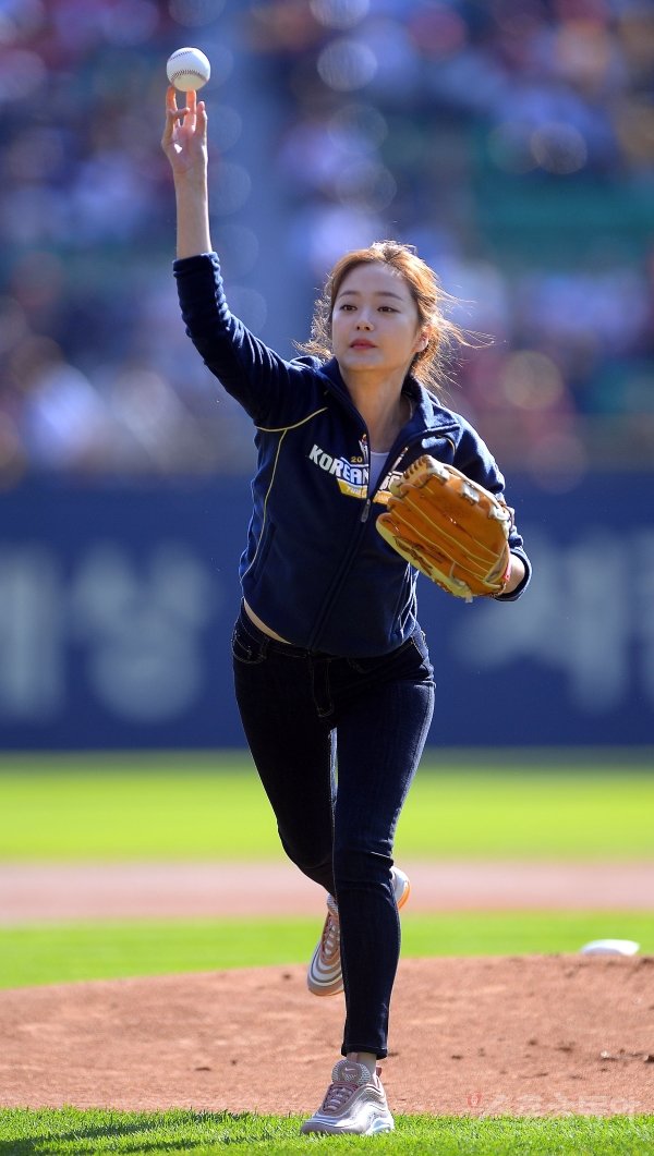 28일 서울 잠실야구장에서 ‘2017 타이어뱅크 KBO리그’ 포스트시즌 한국시리즈 3차전 KIA타이거즈와 두산베어스의 경기가 열렸다. 배우 전소민이 경기를 앞두고 열린 시구행사에서 힘차게 공을 던지고 있다.