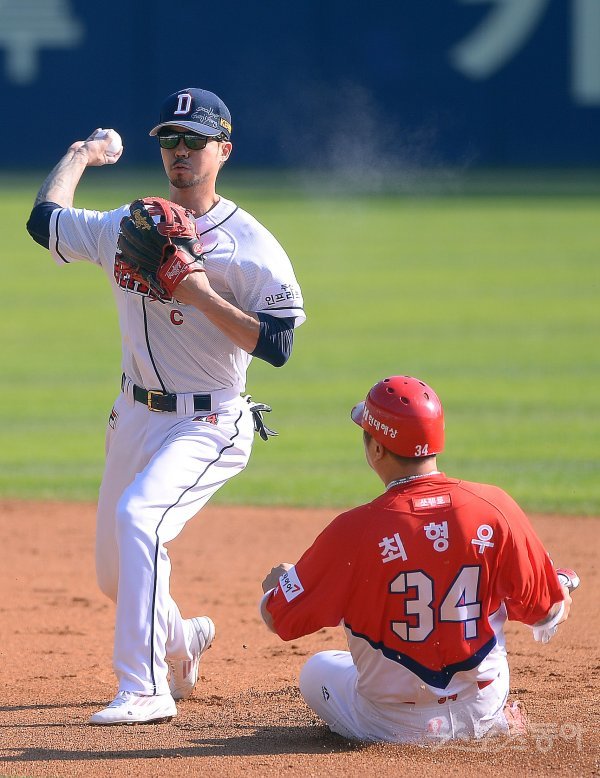 28일 서울 잠실야구장에서 ‘2017 타이어뱅크 KBO리그’ 포스트시즌 한국시리즈 3차전 KIA타이거즈와 두산베어스의 경기가 열렸다. 2회초 무사 1루에서 두산 2루수 오재원이 KIA 이범호의 3루수 앞 땅볼에서 2루로 향하는 최형우를 포스아웃 시킨 후 1루로 송구하고 있다.