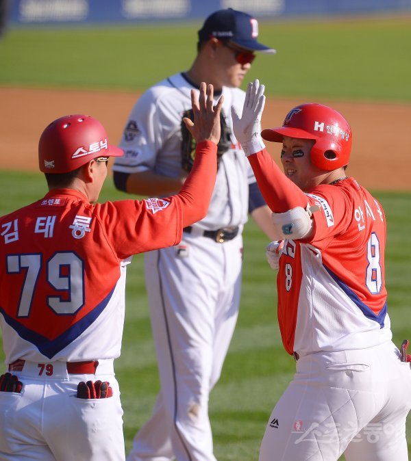 28일 서울 잠실야구장에서 ‘2017 타이어뱅크 KBO리그’ 포스트시즌 한국시리즈 3차전 KIA타이거즈와 두산베어스의 경기가 열렸다. 4회초 1사 2,3루에서 KIA 안치홍이 2타점 적시타를 친 후 김태룡 코치와 하이파이브를 하고 있다.