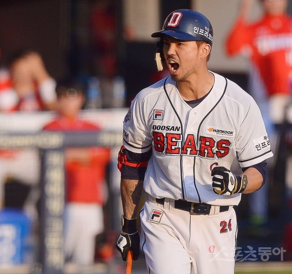 28일 서울 잠실야구장에서 ‘2017 타이어뱅크 KBO리그’ 포스트시즌 한국시리즈 3차전 KIA타이거즈와 두산베어스의 경기가 열렸다. 8회말 무사 1루에서 두산 오재원이 볼넷을 얻어낸 후 포효하고 있다.