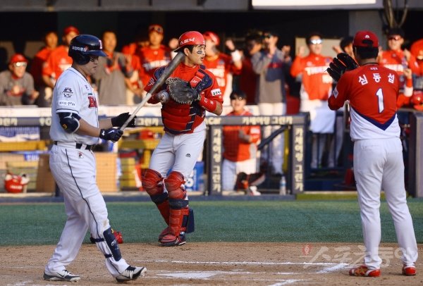 28일 서울 잠실야구장에서 ‘2017 타이어뱅크 KBO리그’ 포스트시즌 한국시리즈 3차전 KIA타이거즈와 두산베어스의 경기가 열렸다. 8회말 1사 1,3루에서 두산 오재일이 파울 플라이로 아웃되고 있다.